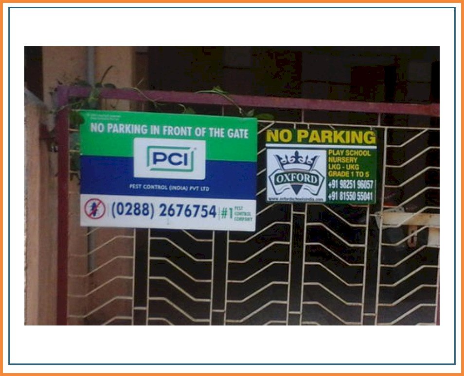 The advertisement will appear on Metal or Teen sheet material No Parking boards, typically measuring 18 inches in width and 12 inches in height. No Parking Board Advertising was done on the society gate. No Parking Board advertising offers a unique and eye-catching way to promote your brand or message.