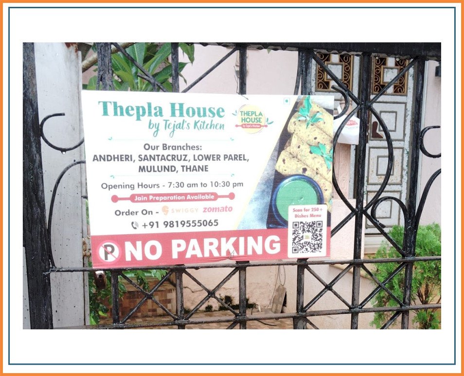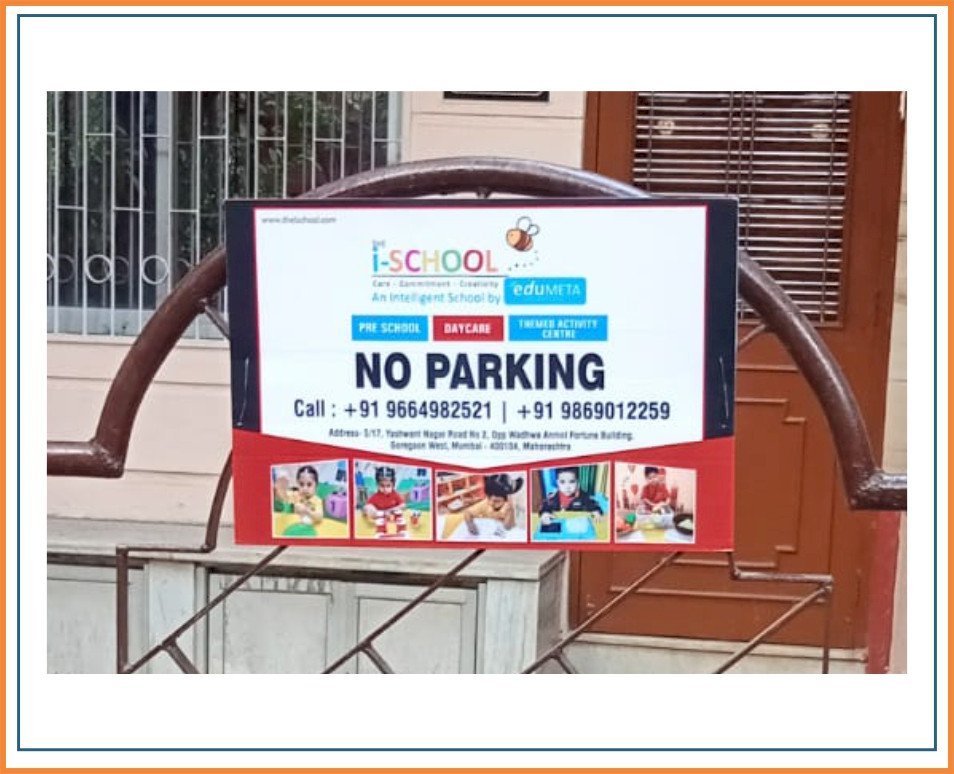 The advertisement will appear on Metal or Teen sheet material No Parking boards, typically measuring 18 inches in width and 12 inches in height. No Parking Board Advertising was done on the society gate. No Parking Board advertising offers a unique and eye-catching way to promote your brand or message.