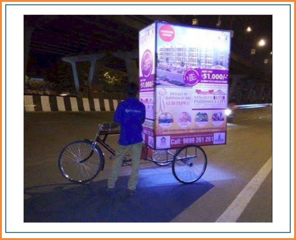 Read More Tricycle advertising offers a unique and eye-catching way to promote your brand or message. Tricycles equipped with boxes featuring printed advertisements on all four sides will operate within a 3-4 km radius of a specific area. They will be active for 8 hours daily.
